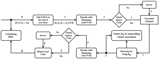 After applying threshold detection to convert the scalar signal received from the cascaded channel into a binary signal r’, this binary signal is multiplied with to identify the error bit position in the error table. The error table enables correction of a single bit error in r’. Once the error is corrected, the resulting codeword is checked for its sparse code characteristics. Specifically, if the last three bits of are any of the following: [0 0 0], [0 0 1], [0 1 0], or [1 0 0], these last three bits are removed to retrieve the user data (recovered signal) . Otherwise, is inverted, and then, the last three bits are removed to obtain . Finally, the signals u and are utilized to evaluate the BER performance.