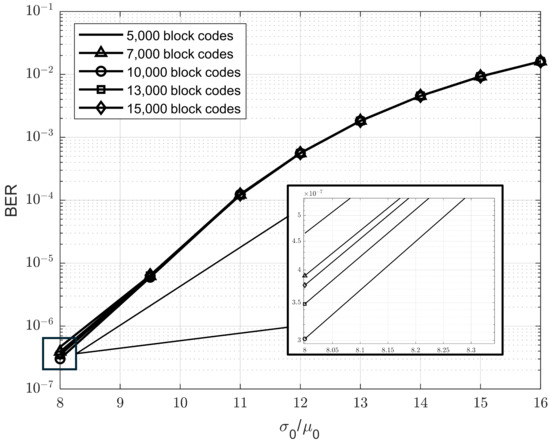 Figure 8 illustrates the BER performance of our method using various window sizes: 5000, 7000, 10,000, 13,000, and 15,000 block codes. The results indicate that a window size of 10,000 block codes achieves the best BER performance (i.e., the optimal point) at a ratio of 8%. Furthermore, in the range of ratios from 9.5% to 16%, the performance gap among different window sizes is negligible. We also conducted simulations for ratios between 5% and 7%; however, the results were not significantly different from those at 8% and thus are not included in the figure. Based on these findings, we selected 10,000 block codes as the sliding window size for our proposed model.