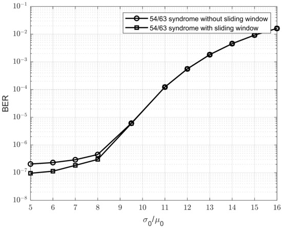 To calculate the complexity of our proposed model, we began with the decoding model of the 54/63 syndrome and added the operators introduced by the sliding window mechanism. The number of sliding window operators was estimated based on Equation (13), which was used to count the total number of addition operations across 10,000 data blocks. The value of Rth obtained from these 10,000 blocks was then used to detect the next 1000 data blocks, using a step size of 1000 blocks (i.e., the previous sub-window size was 1000). Therefore, the total number of operators for the 10,000 blocks was divided by 1000 to determine the average number of operations per data block. Since each data block consisted of 63 bits, the number of operations per block was further divided by 63 to compute the number of operations per detected bit. This final value was then added to the number of operators used in the 54/63 syndrome decoding from [23].
