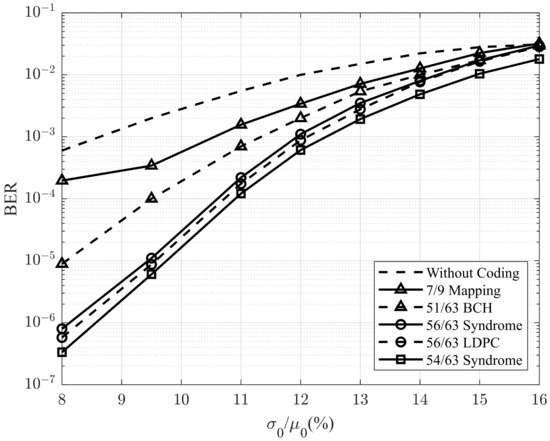 Figure 10 illustrates the BER performance of the proposed method in comparison with those of previously reported techniques, incorporating updated write error rates. The results indicate that the proposed method outperforms those reported in previous studies. At a BER of 10−4, the proposed method achieves a 2.8% improvement over the 7/9 sparse code. At a BER of 10−6, it shows a 0.5% gain over the 56/63 sparse code. However, when the ratio increases to 16%, the BER performance of the proposed method falls slightly behind that of the 56/63 sparse code, although it still maintains a clear advantage over the 7/9 sparse code.