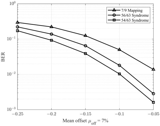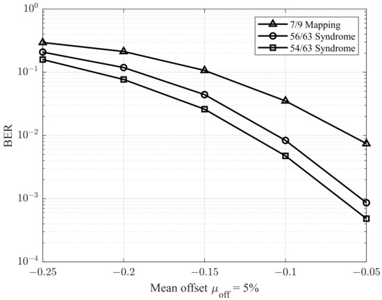 In the next simulations, we adopted the methodology described in [28] to evaluate performance under varying offset conditions. Specifically, the environment was configured with a ratio of 9.5%, and the mean offset was varied from −0.25 to −0.05. The corresponding results are presented in Figure 11 and Figure 12, which illustrate the BER performance for ratios of 5% and 7%, respectively. As shown in Figure 11 and Figure 12, the proposed model demonstrates superior performance compared to previous studies.