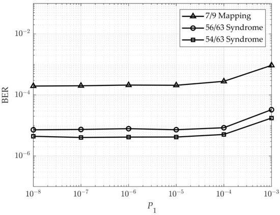 Using the 7/9 method, 450*7/9 = 350 nm. To maintain the same area density of user bits in this method, the size of each MTJ must be reduced. This allows more MTJs to be added within the same area compared to the no-coding method. Assuming 450 nm for the no-coding method and 350 nm for the 7/9 method, the authors of [13] indicate that this size reduction leads to a 25% increase in the error rate. We typically used P1 = 2 10−4. Therefore,