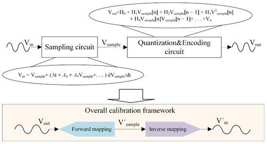 In Equation (7), the quantizer’s output is related to its input (the output of the sampling circuit) through a functional relationship, representing a forward mapping. Conversely, in Equation (11), the sampling circuit’s input and output are related via an inverse mapping, where the output signal represents the input signal. This reciprocal relationship inspires us, as illustrated in Figure 3, with regard to a calibration model being able to be constructed by exploiting these different mappings and enabling effective correction of distortions. Because the response of the electronic components in the quantization circuit exhibits minimal variation under different input signals, the coefficients in Equation (7) vary only slightly. In contrast, the switch circuit associated with Equation (11) is significantly more affected. Consequently, nonlinear distortions can be distinctly classified into static baseline nonlinear distortion and dynamic nonlinear incremental distortion, corresponding, respectively, to the two inverse mapping processes described above.