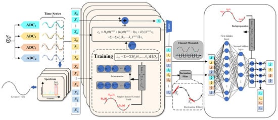 In response to these challenges, digital calibration technologies have been extensively developed in recent years due to their adaptability to process and voltage variations. For instance, ordered element matching (OEM) calibration is an improved method for dynamic element matching (DEM) technology [1,2], mainly used for compensating unit errors in analog-to-digital converters (ADCs) to improve linearity and performance; moreover, it can accurately reduce mismatch problems caused by manufacturing process deviations. Also, statistical and signal correlation-based methods [3,4,5,6] are widely employed to estimate nonlinear distortions and mismatch errors. When combined with least mean squares (LMS) algorithms, these methods enable ADC calibration in the digital domain [7]. Additionally, pseudo-random signals with well-defined characteristics can be injected into the ADC input to identify and estimate nonlinear distortions and mismatch errors [8,9,10], which are then corrected using adaptive algorithms. However, constrained by their reliance on statistical independence assumptions and linear time-invariant models, these methods achieve only partial error calibration. Although polynomial modeling methods, such as Volterra polynomials, can model multi-order nonlinear distortions with memory effect in TI-pipelined ADCs through generalized nonlinear expressions, their fixed coefficients fail to track frequency-dependent dynamic nonlinear distortions [11]. Furthermore, LMS-based adaptive coefficient updates require ideal reference signals, typically necessitating additional high-precision reference ADCs, which are often impractical to implement in applications.