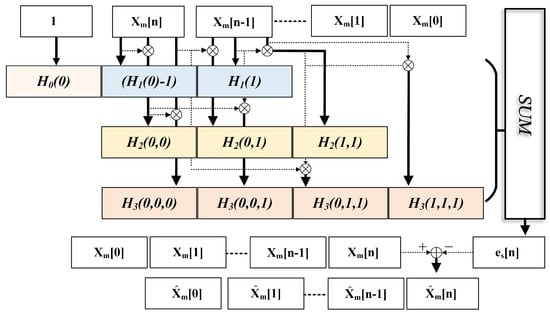 where () denotes the p-th order Volterra kernel coefficients, represents the ideal sampled value at time instant n, and corresponds to the previous time sample. Given that the nonlinearity of MDAC and superimposed dynamic errors exhibit frequency-dependent variations, which would otherwise require coefficient adaptation, we employ backpropagation to train a set of globally optimal Volterra coefficients to extract static baseline distortion of each sub-ADC, thereby eliminating the need for adaptive updates. As shown in Figure 5, the m-th ADC’s static errors can be expressed as follows: