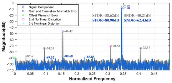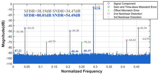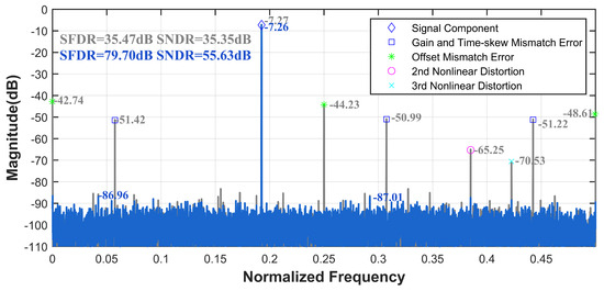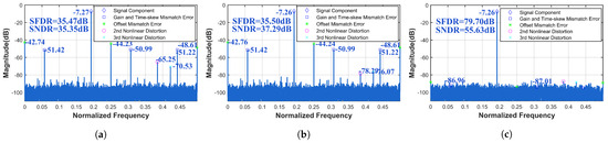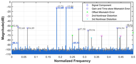 After the above analysis, when an external signal source is fed into multiple channels, clock signal delays, nonlinear effects of the switch circuit, and quantization circuits lead to the fusion of nonlinear distortions and channel mismatch errors in the TI-pipelined ADC’s output. The switch circuit and similar structures are influenced by the analog circuitry’s frequency response characteristics. Input signals with different frequencies manifest varying degrees of nonlinear distortions and mismatch errors in the TI-pipelined ADC’s output. For single-channel nonlinear distortion, second- and third-order harmonics dominate.