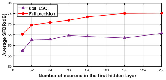We designed the proposed calibration structure using the Verilog hardware description language and implemented it on the Xilinx Zynq UltraScale+ MPSoC XCZU15EG to realize online calibration. In practical applications of the proposed calibration model, employing low-bit-width quantization methods and reducing the number of hidden layer neurons can significantly conserve computational hardware resources. Figure 14 illustrates the relationship between SFDR and the number of nodes in the first hidden layer for the commercial four-channel TI-pipelined ADC with a 16-bit resolution and 1000 MS/s sampling rate after calibration using a fixed set of neural network weights under various configurations of hidden layer neurons and quantization schemes. When using a full-precision scheme with 32 neurons, the average accuracy across the entire frequency band decreases by only 5 to 6 dB compared to a full-precision scheme with 256 neurons. After applying the learned step size quantization (LSQ) scheme [32], with both weights and inputs quantized to 8 bits, the SFDR can still reach 62 dB.