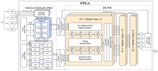 As depicted in Figure 15, the forward propagation calibration model was deployed on the FPGA platform. To synchronize with the 1000 MS/s sampling rate of the four-channel TI-pipelined ADC, a clock frequency of 250 MHz was utilized in the Volterra data processing unit, which is strictly aligned with the sampling rate of the single-channel pipelined ADC. In the derivative generation module, a clock frequency of 500 MHz was employed, achieving full pipelining by leveraging the properties of anti-symmetrical tap coefficients and zero intermediate coefficients. This optimization reduced the parallelism from 2 × 32 to 2 × 16. To support the implementation of high-frequency circuits, we adopted a multi-stage pipelined design for the multiply–accumulate (MAC) operations within each processing element (PE) unit. Specifically, the multiplication operations were structured with a five-stage pipeline, while the addition operations utilized a three-stage pipeline. Both multiplication and addition computations were executed using digital signal processors (DSPs), thereby eliminating the need for lookup table (LUT)-based adder implementations. This approach effectively reduced LUT resource consumption.