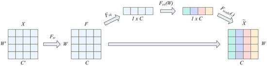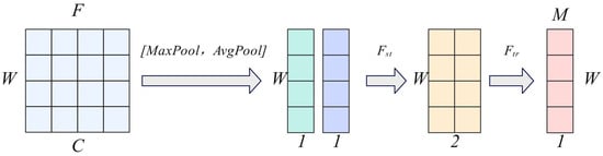 - Squeeze: Spatial features (channel number C and two-dimensional spatial dimensions H × W) are compressed along the spatial dimension into channel description vectors through global average pooling. Compared with the C × H × W structure of image data, this paper omits the spatial dimension H × W of the time series and retains only the time channel C and the spatial dimension W composed of multiple indicators. The calculation method is shown in Equation (3). FC denotes the feature matrix F on the Cth channel and FC(i) denotes its value at the ith time step.