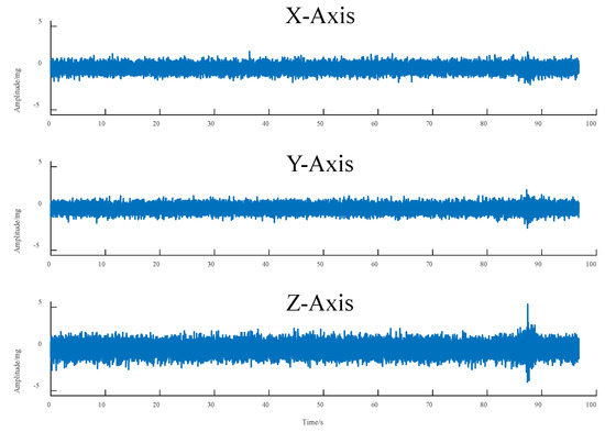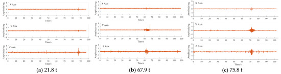 As can be seen from Figure 6, when the above vehicle passes through the monitoring point, the acceleration sensor produces a significant response in all three directions. Taking the data of a vehicle with a load capacity of 21.8 t as an example, the peak value of the vertical upward vibration response signal is 5.12 mg, the peak value of the horizontal vibration response signal in the X-direction is 1.97 mg, and the peak value of the vibration response signal in the Y-direction is 0.69 mg. It can be seen that the vibration signal in the vertical direction of is significantly larger than the remaining two directions. By analysing the pavement vibration data under different vehicle loads (21.8 t, 67.9 t, and 75.8 t), it can be found that the amplitude and duration of vibration show a significant upward trend with the increase in vehicle weight. The horizontal (X-axis) and longitudinal (Y-axis) vibrations exhibit relatively small amplitudes, in the range of ±1 mg and ±3 mg, respectively. In addition, the Z-axis signals contained more high-frequency components, especially during the vehicle passage period (60–80 s), indicating a strong correlation between vehicle weight and the dynamic response of the pavement. These findings provide valuable insights into the effects of heavy vehicle loads on the behaviour of pavement structures, which can be used for pavement infrastructure performance assessment.