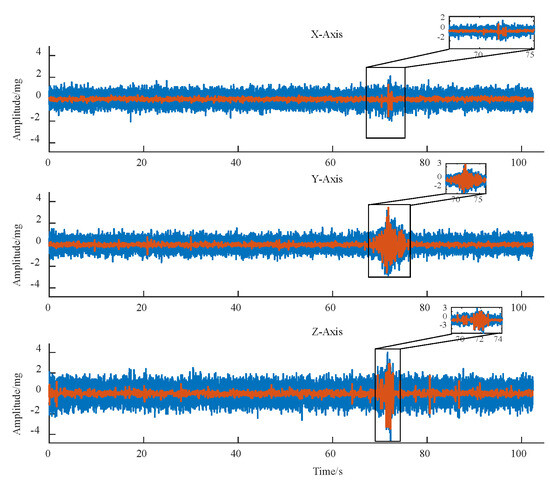 Figure 2 illustrates the road vibration data recorded as a two-axle vehicle, with a load capacity of 21.8 t, traverses the monitoring point. Concurrent video analysis confirms that the peak signals align precisely with the vehicle’s passage, unequivocally establishing that the peak vibration signals at the monitoring point are indeed attributable to the excitation from the test vehicle. As is evident in Figure 2, the triaxial vibration response signals captured by the monitoring system are substantially corrupted by noise. Notably, the number and magnitude of signal fluctuations in the X- and Y-directions are considerably greater than those in the Z-direction. The power response is most pronounced along the Z-axis. The presence of these noise signals introduces considerable interference, complicating both the identification of vehicle excitation events and the subsequent isolation and analysis of power response signals. Consequently, denoising the raw signal is a necessary prerequisite.