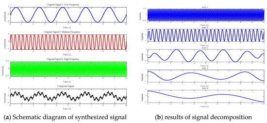 Firstly, three basic signal components with different frequency characteristics were constructed: (1) a low-frequency signal f1(t) = 2sin (πt), with a frequency of 0.5 Hz, which represents the low-frequency trend of the signal;