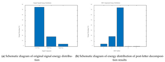 It is worth noting that the EMD decomposition yields a greater number of IMFs (5) than the number of original signal components (3). This is due to the adaptive nature of the EMD method, where subsequent IMF components may contain residual trends in the signal or components arising from boundary effects. In order to determine the effective frequency components, the original signal and IMF signal energy were analysed, and the results are shown in Figure 5. In the original signal, the energy share of the low-frequency signal f1 is 76.19%, the energy share of the medium-frequency signal f2 is 19.05%, and the energy share of the high-frequency signal f3 is 4.76%. In the EMD decomposition results, the energy share of IMF1 is 4.92%, the energy share of IMF2 is 19.40%, the energy share of IMF3 is 75.25%, the energy share of IMF4 is 0.17%, and the energy share of IMF5 is 0.26%. The first three IMF components contain the main energy of the signal, which is in accordance with the composition of the original signal, so IMF1-IMF3 are the effective components of signal decomposition.