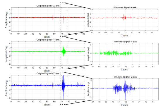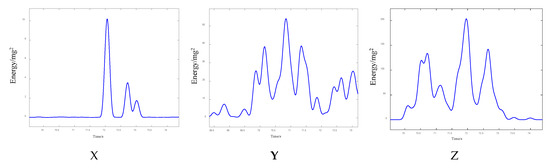 Figure 12 illustrates the temporal distribution of short-term energy (STE) derived from tri-axial sensor data (X-, Y-, and Z-axes) during a vehicle passage event between 69.5 s and 74.5 s. Distinct response patterns are observed across the axes: