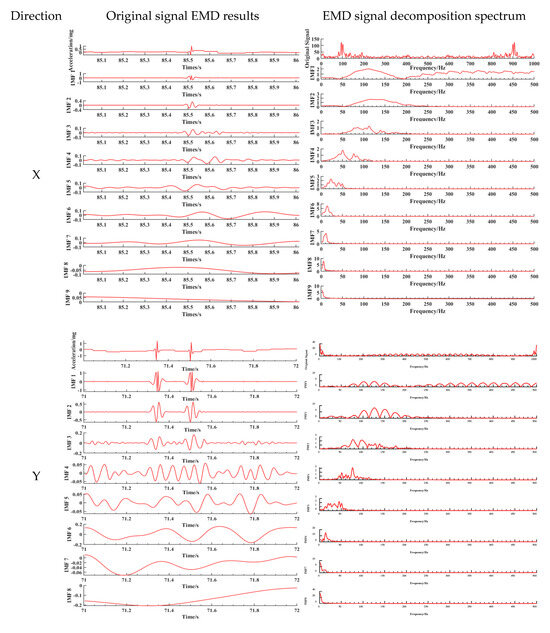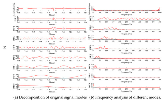 The original vibration signal is complex and consists of noise signals and axle excitation signals, where the axle excitation signals are mainly concentrated in specific frequency bands, while the noise signals are uniformly distributed over the frequency range. In order to eliminate the noise and extract the useful signal, the empirical modal decomposition (EMD) method is used for signal reconstruction [29,30,31,32,33,34,35]. It is a decomposition method that decomposes the original signal into several intrinsic components, i.e., intrinsic modal functions (IMFs). Each IMF represents a detailed component of the original signal in a different frequency band. The IMF is a function that satisfies the following two requirements:
