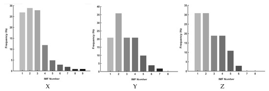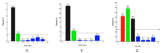 In order to further understand the characteristics of the vibration signals of cement pavements under on-board excitation, in addition to the basic analysis of the three-axis time and frequency domains, it is also necessary to carry out a more detailed study from the perspective of nonlinear and nonsmooth signals. Since the vibration signals caused by vehicle excitation often contain complex dynamic responses, and their characteristics may change significantly with time and frequency, it is difficult to fully reveal their intrinsic characteristics and energy distribution laws by only relying on the traditional time–frequency domain analysis. Empirical mode decomposition (EMD), as an adaptive method for nonlinear and nonsmooth signal processing, can decompose the original vibration signals into a series of intrinsic mode functions (IMFs), which provide a powerful tool for studying the local characteristics of the signals. Based on this, the following section uses the EMD method to decompose the triaxial vibration signal, analyse the characteristics of different modal components, and discuss them in depth in conjunction with the short-time energy. This can not only reveal the distribution law and time-varying characteristics of different frequency bands of energy in the vibration signal but also provide a key basis for the subsequent anomaly identification and damage diagnosis in the health monitoring of pavement structures. Therefore, this part of this study extends the dimension of the characterization of vibration signals and also provides an important support for the mining of multi-scale characteristics of vibration signals