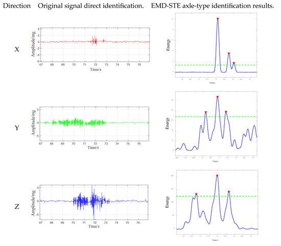 In order to directly demonstrate the effectiveness of the method proposed in this paper, Figure 13 lists the comparison between the original signal and the axle pattern recognition effect processed by the EMD-STE method. This figure shows the clear results after processing the same original signal segment. The original signal segment contains many peaks, making it difficult to directly identify the vehicle axle pattern, and the number of peaks makes it difficult to directly match the vehicle axle pattern. After processing using the method proposed in this paper, the number of peaks obviously matches the number of axles of the vehicle. In the result diagram of vehicle axle type identification using the EMD-STE method, the blue trajectory depicts the time curve of this STE signal. The dashed green line represents the minimum peak height threshold employed by the peak detection algorithm, and only STE peaks exceeding this amplitude are considered potential axle events. Three distinct peaks in the STE signal exceed the defined threshold. These detected events are indicated by red inverted triangles, and the actual working condition is the passage of three axles of the vehicle. The STE analysis, combined with a threshold-based peak detection strategy, successfully identified three different energy events in the signal, corresponding to the expected number of axles of the target vehicle. The axle-related STE peaks appear to be significantly higher than the baseline energy level, indicating a good signal-to-noise ratio in the STE domain for this particular event. This helps to achieve reliable threshold processing. This direct comparison before and after processing illustrates that the method proposed in this paper effectively solves the core challenges, such as noise interference and peak adhesion in the original signal.