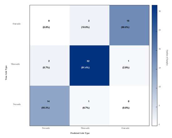 As can be clearly seen from Figure 14, the algorithm demonstrates excellent identification performance. Of the 15 two-axle vehicles, 14 were correctly identified (93.3% recall); of the 35 three-axle vehicles, 32 were correctly identified (91.4% recall); and of the 20 four-axle vehicles, 18 were correctly identified (90.0% recall). This method performs well on this data set but is limited by experimental conditions. The number of experiments carried out is still relatively small and will continue to be carried out in the future.