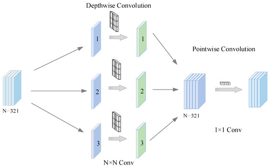 Depthwise separable convolution is a convolutional operation designed to reduce computational complexity while enhancing feature extraction capability [26,27,28]. It decomposes the standard convolution into two steps: depthwise convolution and pointwise convolution, significantly reducing the amount of computation while preserving the model’s representational power.