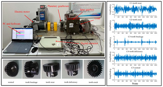 To validate the proposed method, this study uses gear vibration data collected from the Drivetrain Diagnosis Simulation (DDS) testbed at China University of Mining and Technology. As shown in Figure 3, the test rig is composed of a two-stage planetary gearbox, a two-stage parallel-axis gearbox, a programmable magnetic powder brake (load range: 1.5–32 ft·lb), a 3-horsepower AC motor (variable speed up to 5000 rpm), a torque sensor (range: 20 N·m, integrated with a 360-pulse encoder), and various vibration sensors mounted on bearing housings and gearboxes. The system allows the introduction of both single and coupled faults in the gear and bearing components, and supports the application of torsional and radial loads to simulate real operational stresses.