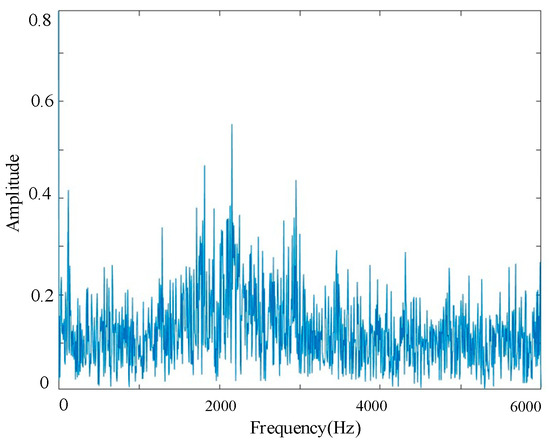 To investigate the frequency–domain characteristics of gear faults, a representative set of signals with broken-tooth faults is selected as a case study. Fast Fourier Transform (FFT) is applied to reveal the frequency characteristics of the signal. As shown in Figure 4, the main frequency components are concentrated within the range of 0–3000 Hz, with a prominent spectral peak observed around 2200 Hz. This peak is typically associated with the periodic impacts caused by broken teeth, which introduce abrupt changes in meshing force and excite strong vibration responses. Notably, under the current gear parameters and rotational speed, 2200 Hz corresponds to a harmonic of the gear mesh frequency (GMF), making it a critical indicator for identifying broken-tooth faults.