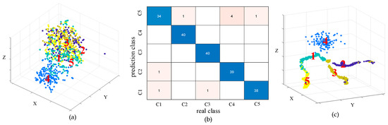 Confusion matrix and t-SNE visualization of the DSCNN Model. (a) t-SNE of the input layer; (b) confusion matrix; (c) t-SNE of output layer.