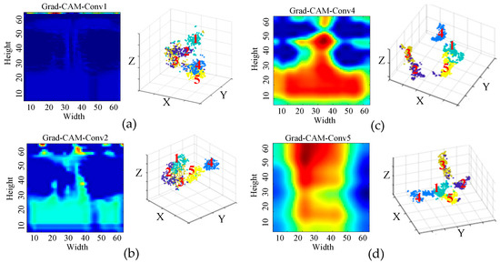 Visualization results of the network feature extraction layers. (a) Grad-CAM-Conv1; (b) Grad-CAM-Conv2; (c) Grad-CAM-Conv4; (d) Grad-CAM-Conv5.