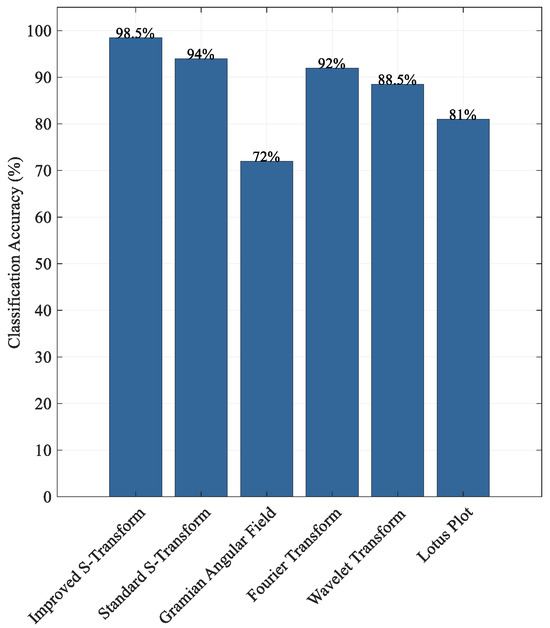 To validate the effectiveness of time–frequency representation images as model inputs for fault diagnosis, this study applied WT, Fourier Transform (FT), and Gramian Angular Field (GAF) methods to the noisy signals. The generated time–frequency images were then used as inputs for diagnostic analysis. As shown in Figure 8, the proposed IST method achieved the best performance in fault classification, with an accuracy of 98.5%, significantly outperforming other common time–frequency transformation methods. The standard ST achieved an accuracy of 94%, while FT and WT reached 92% and 88.5%, respectively. In contrast, the Lotus plot (81%) and GAF (72%) exhibited relatively lower performance, indicating weaker feature extraction capability under noisy conditions. Furthermore, the fault identification results demonstrate that frequency–domain or time–frequency domain transformation methods generally outperform pure time–domain images, further confirming the advantages of the proposed method in terms of robustness and classification accuracy.