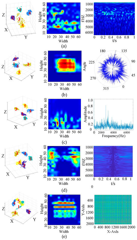 Analysis of features and decision mechanisms of different time–frequency methods in fault identification. (a) visualization of Wavelet Transform; (b) visualization of Lotus Plot; (c) visualization of Fourier Transform; (d) Visualization of standard S-transform; (e) visualization of Gramian Angular Field.