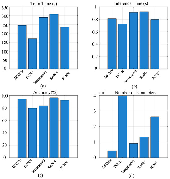 To ensure a fair comparison, the input size of all models was standardized to 64 × 64 × 3, and the output was set to five classes. All models were evaluated on the same training dataset and using consistent evaluation metrics, with unified training strategies including the number of epochs, optimizer, learning rate, and batch size. Although different networks employ their respective classic design approaches (such as the stacked structure of DCNN, residual connections of ResNet, and multi-scale parallel branches of InceptionV3), efforts were made to maintain similar network depths and numbers of convolutional layers across models. This ensured that their feature extraction capabilities were roughly on the same level, minimizing performance bias caused by architectural differences. For example, all models contain approximately five to seven convolutional layers; some models, such as InceptionV3 and the proposed model, utilize parallel or channel-expansion structures, but the overall parameter count was controlled within a reasonable range. The diversity of feature extraction strategies among these models provides a representative basis for subsequent performance evaluation. Figure 10 presents the performance results of each model in the fault diagnosis task for the shearer rocker arm gear, including key metrics such as training time, inference time, accuracy, and parameter count.