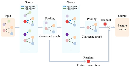 In the GNN, each node’s representation is updated by aggregating node embeddings from its neighboring nodes using graph convolutional layers. This aggregation process can be performed iteratively, allowing nodes to capture information from neighbors at longer distances. The GNN takes node-embedding vectors and edge indices of a graph as input and returns a single feature vector that represents the entire graph. Specifically, the structure of the GNN is illustrated in Figure 3.