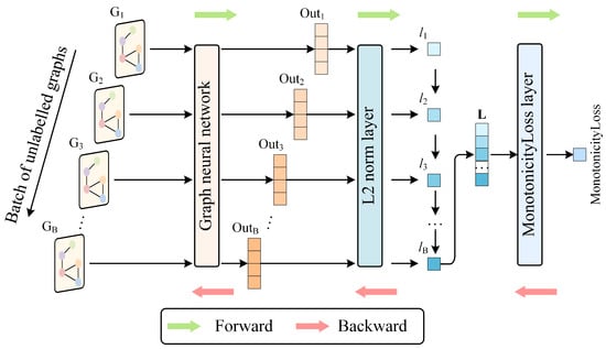 To train a model for capturing latent features from unlabeled data, each unlabeled graph is input into a GNN, which processes the input and outputs an output vector. The GNN outputs B output vectors for a batch size of B unlabeled graphs. The L2 norms of the output vectors are then calculated. These output vectors subsequently pass through the L2 Norm Layer to obtain their corresponding L2 norms, denoted as l1, l2, …, lB. The L2 norm l of an output vector v = (v1, v2, …, vn) is calculated using the following formula: