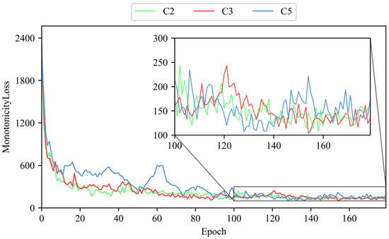 To evaluate the capability of the ULDTM in capturing latent features from tool cutting data, this paper uses the unlabeled datasets from C2, C3, and C5. A smaller monotonicity loss indicates that the ULDTM is more able to capture latent features which evolve as the number of cuts increases. Specifically, the ULDTM separately receives 289 graphs from dataset C2, 238 graphs from C3, and 238 graphs from C5. The monotonicity loss output by each training epoch for datasets C2, C3, and C5 is recorded. The monotonicity loss output by the ULDTM for C2, C3, and C5 is shown in Figure 9.