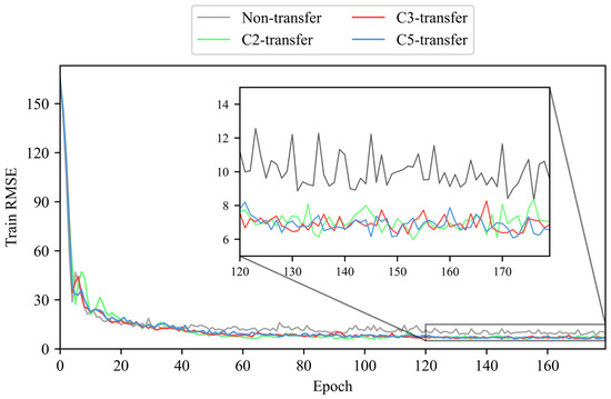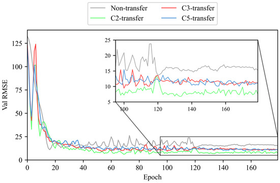 We use the LDTM to train and validate tool RUL prediction, respectively, on the training dataset (C1 and C4) and validation dataset (C6) [38]. This paper compares the performance of the LDTM under four conditions: without transfer learning (non-transfer) and with transfer learning enhancement from unlabeled datasets C2 (C2-transfer, etc.), C3, and C5. The RMSE is recorded during both training and validation phases. To ensure the reliability and credibility of the experimental results, each result presented is the median of multiple trials. The RMSE values of training and validation phases without/with unlabeled dataset enhancement are shown in Figure 10 and Figure 11.