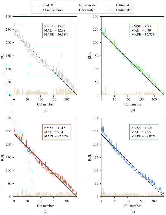 According to the results shown above, it is evident that the use of transfer learning leads to a more stable convergence of RMSE, as well as oscillation reduction and a smaller convergence value during both training and validation of tool RUL prediction. This indicates that the proposed method can effectively utilize unlabeled data to enhance the training and validation of labeled data tool RUL prediction.