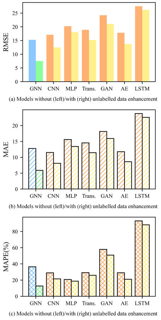 The RMSE, MAE, and MAPE of tool RUL prediction for models using C1 + C4 as the training dataset and C6 as the validation dataset. (The indicators are calculated based on the labels and predicted tool RUL of C6. As is shown in the figure, the indicators are smaller with unlabeled data enhancement across all these models).