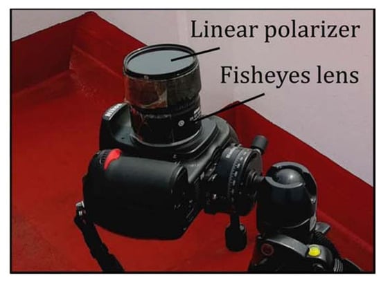 In early studies, polarizers were generally assembled directly in front of the camera and manually rotated. In 1997, Voss et al. [52] applied a time-division polarimeter to measure vector information of skylight, designing a polarization radiation distribution camera system based on a fisheye lens, a CCD camera, and a dichroic polarizer integrated into the camera system. By rotating the linear polarizer, polarization images were captured at 0°, 45°, and 90° polarization angles. In 2014, YJ Wang et al. [28] optimized the measurement setup to improve the accuracy of skylight polarization measurements. They established Cartesian coordinate systems for the pixel coordinates of the skylight (), the lens coordinates , and the incident light coordinates . During data acquisition, three images were captured with the polarizer oriented in three directions, and the polarization parameters were determined through three exposures. After establishing the algorithm, they obtained the polarizer’s polarizing film axis angle, , which is the optimal value of β that minimizes the estimation error of the polarization angle . This finding also explains why the fields of view of some insects’ polarization opposition units (POL-OP units) are concentrated around the zenith at an approximate 60° angle. In 2018, L Guan [44] used a rotating polarizer-based polarization measurement system to study the polarization pattern of the sea sky. It was proven that the polarization distribution of the sea sky is basically the same as that of the land, and the effectiveness of the time-sharing polarization imaging system was also verified. This kind of time-sharing polarimeter system has a relatively simple design and is easy to set up, so it is quite attractive; the physical system employed is schematically illustrated in Figure 2. However, a significant drawback is that both the scene and the measurement platform must remain stationary during the measurement process to avoid introducing inter-frame motion.