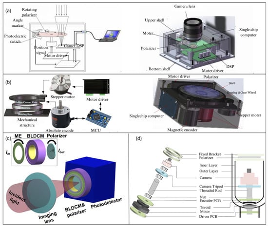 The manual rotation method of polarizing devices has the drawback of not achieving an adequate frame rate. Replacing manual rotation with a motor-driven polarizer can effectively reduce the time interval between two consecutive frames. In 2018, Y Han et al. [53] improved the imaging method of continuously rotating polarizers by using a rapidly and uniformly rotating polarizer combined with feedback exposure control, along with an improved pipeline-based polarization image processing approach, which greatly enhanced the speed of polarization pattern detection, as shown in Figure 3a. In 2022, N Gu et al. [54,55] invented a polarization modulator consisting of a high-speed brushless DC motor (BLDCM), a high-precision micro motor, and a high-extinction-ratio polarizer. The polarizer is installed with a precise magnetic encoder (ME) on the high-speed BLDCM. The photodetector is integrated with the BLDCM to collect the polarized intensity modulated by the polarizer, as shown in Figure 3c. In 2024, a new method was proposed to precisely calibrate the transmission angle of the polarizer by using a Wollaston prism online, allowing the invented rotating motor to start rotating from any initial angle, thus providing a solid reference for polarization imaging and polarization calibration. In 2024, F. Kong et al. [56] used 3D-printing technology to create mechanical rotating components and employed a stepper motor to drive the polarizer, allowing the polarizer to rotate rapidly in front of the camera lens. They designed the “PSC-004” Polarization Sky Window Compass based on mechanical rotation. This innovative design enables precise and fast rotation of the polarizer, which is essential for dynamic polarization imaging and accurate measurements. The use of 3D printing offers the advantage of customizable and efficient manufacturing of the mechanical components, enhancing the system’s functionality and ease of use, as shown in Figure 3b. Also in 2024, X. Lu et al. [57] proposed a rotation system that uses an encoder to capture the current position and transmit it to the drive circuit board. The drive circuit board generates voltage signals based on the current position to drive the rotation. To address the error accumulation caused by continuous rotation of the polarizer in the polarization rotation stage, they proposed a method to determine the true rotation angle of the polarizer when the rotation angle is unknown, as shown in Figure 3d. All the aforementioned polarimeters for navigation and positioning purposes are designed for direct detection of skylight polarization. In 2023, CQ Zhang [58] proposed a novel portable indirect polarization parameter microscopic imaging system. This system places a polarization-sensitive marking device on the surface of the object being tested. The camera continuously captures images of the object, while the polarizer automatically rotates to modulate the polarization imaging; this allows the system to intelligently measure the polarization information of incident light with unknown polarization angles within the coverage area, providing a new approach for detecting the polarization state of skylight.