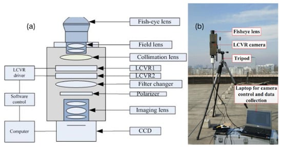 (a) The schematic diagram of the ground-based all-sky imaging polarimeter utilizing LCVR technology. (b) The schematic representation of the experiment [62].