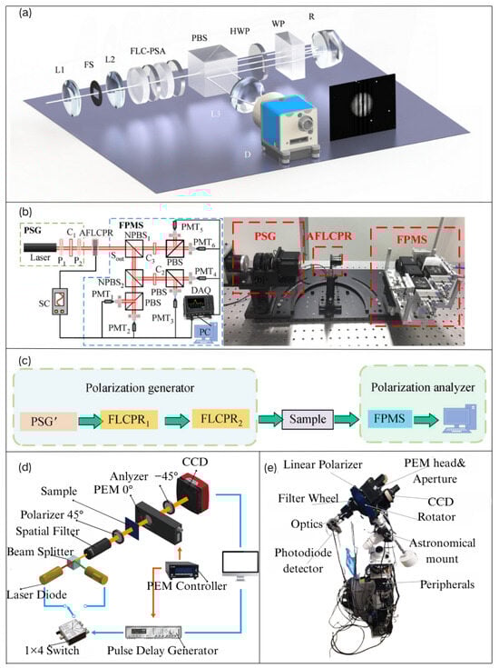 (a) Schematic representation of a time-division Fourier-transform imaging spectroscopic polarimeter employing ferroelectric liquid crystal (FLC) and a Wollaston interferometer [29]. (b) The experimental schematic for the characterization of AFLCPR [67]. (c) The schematic representation of a Mueller-matrix polarimeter using a dual-ferroelectric liquid crystal retarder [67]. (d) Optical arrangement of the Stokes polarimetric imaging system employed by CY Han [71]. (e) The polarimeter for skylight detection employed by Vasiliki [72].