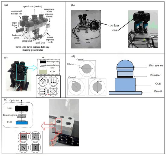 (a) The setup of the 3-lens, 3-camera, 180° all-sky field-of-view polarization imaging system used by Horvath [79]. (b) The polarimeter combining both point-source and image-based approaches [30]. (c) The polarization instrument designed by C. Fang [25]. (d) The all-sky polarization system: The left image shows the all-sky polarization imaging system used for polarization detection, while the right image illustrates the polarization imaging system composed of a fisheye lens and CCD [80]. (e) A schematic of a bionic polarization navigation system used for capturing daylight polarization patterns. The system includes four optical systems, each consisting of an optical lens assembly, a polarizer, and a CCD detector used to detect daylight polarization patterns [83].