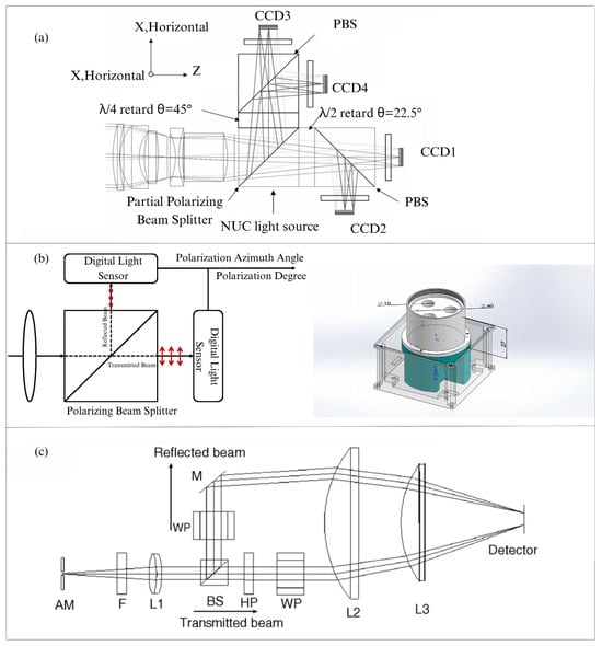As early as the 1990s, Azzma utilized amplitude division devices such as beam splitters, PBSs (polarizing beam splitters), and even optical fiber diffraction to divide the incident light into multiple beams with different polarization states [84]. Depending on the number of optical elements used, different dimensional Stokes parameters can be measured [45]. In order to determine the complete Stokes parameters, many polarization imaging polarimeters that use beam-splitting prisms will use three or more optical devices [85,86]. In 2009, Pezzaniti et al. [87] combined an 80/20 partial polarization beam splitter, two 50/50 polarization beam splitters, a 1/4 and a 1/2 waveplate to form a beam splitter block, realizing relatively precise orthogonal polarization imaging, as shown in Figure 8a. In the same year, Fujita et al. [88]. employed a non-polarizing beam splitter placed near the reimaged pupil to separate the incident beam into transmitted and reflected beams. Then, they used two separate Wollaston prisms and waveplates, which divided the incident beam into two orthogonal beams to simultaneously capture four polarization images. The schematic of their setup is shown in Figure 8c. Notably, the orthogonal error between the two sets of mutually orthogonal polarizers is one of the error sources in the sensor, which is why PBS is often used as a replacement for polarizers in other polarization imaging configurations for navigation purposes [89]. For example, in 2018, J. Yang et al. [90]. used PBS as a sensor polarizer to design a polarization navigation polarimeter based on a polarizing beam splitter, as shown in Figure 8b. Moreover, considering the optical path coupling and inconsistent extinction ratios between the transmitted and reflected beams, J. Yang introduced a coupling coefficient to eliminate orthogonal errors and established a new sensor model. Notwithstanding the considerable benefits of polarization image polarimeters utilizing PBS, their substantial dimensions and the complexities associated with the accurate calibration of optical components have resulted in problems for practical applications [91,92].