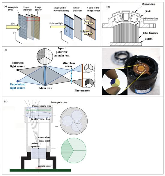 (a) The upper image is the schematic diagram of the polarization unit. The lower image shows the structure of the polarization camera, where the relay lens serves to project the image onto the sensor [32]. (b) The schematic diagram of a bionic compound-eye camera structure [94]. (c) The left image shows the optical path diagram of the imaging system, and the right image displays a wide-angle lens with a linear polarizer triple mirror [36]. (d) The imaging system schematic used by Sturzl. Linear polarizers (green) in different orientations are positioned behind three plano-concave lenses. The camera lens is located on the focal plane of a double-convex lens [35].