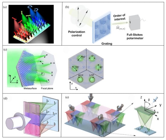 (a) Three-dimensional illustration of a superpixel focusing different polarizations to different spots [96]. (b) The diffraction grating device based on metasurface matrix Fourier optics [97]. (c) The planar metasurface consisting of three polarization beam splitters spatially arranged on a hexagonal pattern proposed by T. Xu [98]. (d) The schematic of the polarization detection metasurface [78]. (e) The schematic of BCEM and the double-focus superlens in the sub-eye, where α and β represent the azimuth angle and elevation angle of the sub-eye’s optical axis, respectively [77].