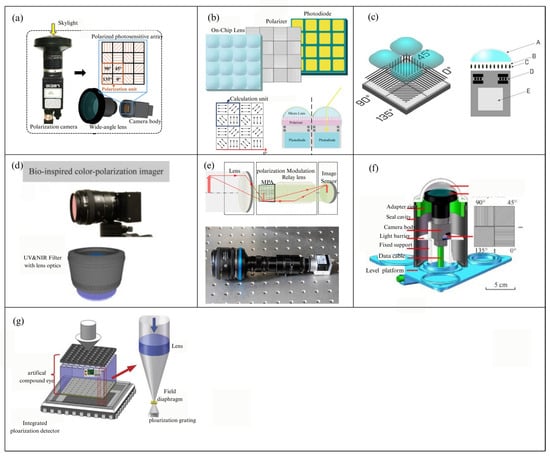 (a) The schematic diagram of the DOFP polarization instrument used in navigation and orientation research under sensor tilt conditions [101]. (b) The DOFP polarization instrument applied for nighttime navigation using nocturnal light [104]. (c) The schematic diagram of the polarization unit of the DOFP polarization instrument applied in combination with an inertial unit for autonomous vehicle navigation [105], The polarization filter (C) of each pixel, coated with an anti-reflection layer (B), is positioned between the lens (A) and the photosensitive photodiode (E). (d) Color polarization imaging sensor. It combines vertically stacked photodetectors and pixelated metal nanowires, with the former used for spectral sensitivity and the latter for polarization sensitivity [107]. (e) The upper image shows the optical path diagram, and the lower image shows the appearance of the DOFP polarization instrument [108]. (f) The 3D interactive section of an underwater imaging polarization sensor [109]. (g) A schematic diagram of the polarization imaging unit and measurement optical path of the polarization instrument inspired by the insect compound-eye structure [110].