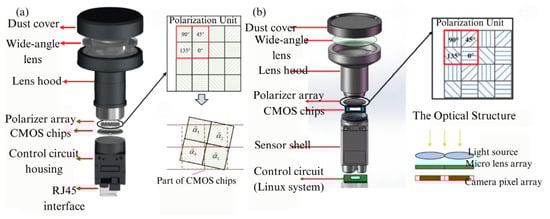 It is worth noting that conventional DOFP polarization instruments face issues such as polarization unit mounting angle errors, pixel response inconsistencies, and varying instantaneous fields of view across pixels, limiting the accuracy of polarization state measurements. To apply polarization imaging sensors in navigation, in 2017, GL Han et al. [39] considered CCD pixel response errors and installation errors of the pixelated polarizer array, proposing a calibration method based on iterative least squares estimation. In 2020, HN Ren et al. [111] regarding the problem of inconsistent extinction ratios between pixels in camera-based polarization sensors, to improve calibration performance, they introduced an extinction ratio coefficient into the polarization calibration model and proposed a calibration method that considers both AOP and DOP errors to enhance the model’s accuracy. The pixel-level polarization CMOS camera sensor structure used in their study is shown in Figure 12b. Sensor noise is a major factor limiting the measurement accuracy of DOFP polarimeters. In 2021, J Yang et al. [112] demonstrated an error model for DOFP polarimeters based on temporal noise and spatial non-uniformity. Compared to existing models that only analyze temporal noise, they modified the normalization conditions in traditional DOFP polarimeter calibration methods, clarified the selection rules for the coefficient matrix in their proposed model, enabling independent and accurate estimation of errors caused by temporal noise and spatial non-uniformity. In 2023, Y Fan et al. [113] suggest an error model in response to the problems of the four pixels in a superpixel do not measure the same sky region but instead measure with different instantaneous fields of view and vary in azimuth angles, suggest an error model Their error modeling showed that the proposed method effectively reduces polarization measurement errors and improves positioning accuracy based on outdoor experimental results. In 2024, GM Li et al. [114] innovatively applied the Berry model, considering the impact of neutral points, to obtain robust heading information. In the DOFP polarimeter structure they employed, scattered light from the atmosphere enters the array polarization units after passing through a wide-angle lens and a light shield, with each polarization unit consisting of four adjacent pixel channels. Each polarization sensor contains 2048 × 2448 channels, as shown in Figure 12a.