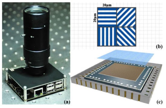 (a) Photo of the integrated micro-polarizer array sensor. (b) Schematic diagram of the micro-polarizer array. (c) The polarization-related detection module fabricated by integrating the micro-polarizer array with CMOS through UV-NIL [116].