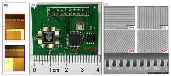 The polarization chip fabricated by integrating nano gratings with image chips by using NIPL technology [117]. (a) The photograph of the integrated polarization sensor. (b) Partially enlarged detail photographs of the nanogratings and adjacent electrodes on the polarization chip. (c) SEM images of multidirectional nanogratings on a silicon test piece fabricated via the same integration process.