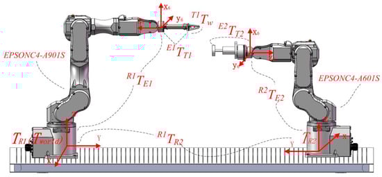 R1Tw represents the transformation matrix from the workpiece coordinate system to the master robot’s base coordinate system. Upon specification of the grinding task requirements and the determination of the tool path trajectory, this transformation matrix becomes fully defined and serves as a known parameter in the system;