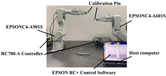 The calibration experimental platform consists of an RC700-A controller with a host computer, two robotic manipulators, and a calibration probe, as illustrated in
